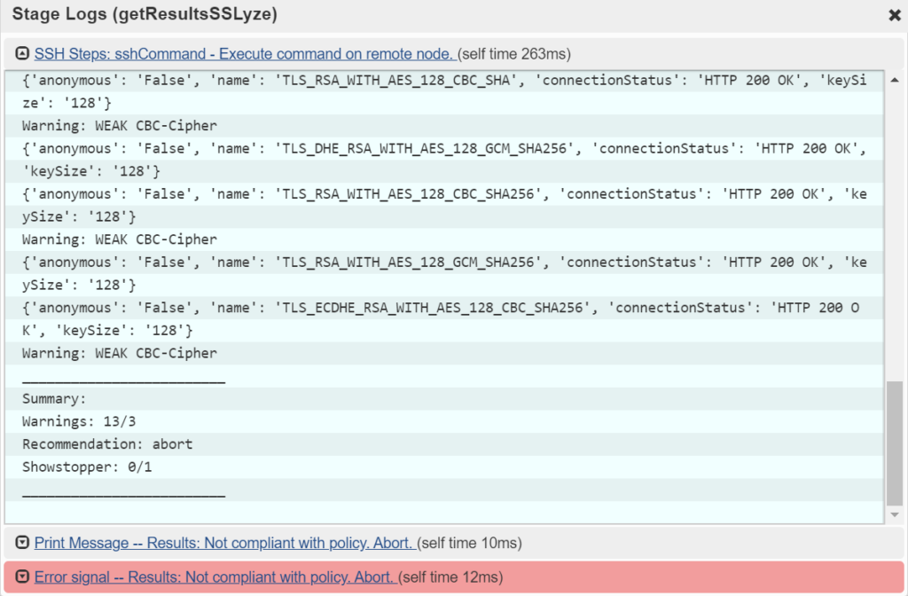Die Infos dazu liefert das Python-Script. Wir haben beispielsweise alle Cipher Suites mit dem Betriebsmodus CBC als „Warning“ markiert – und festgelegt, dass ab einer Gesamtanzahl von 3 Warnings die Stage failed – nicht aber der gesamte Build-Prozess: